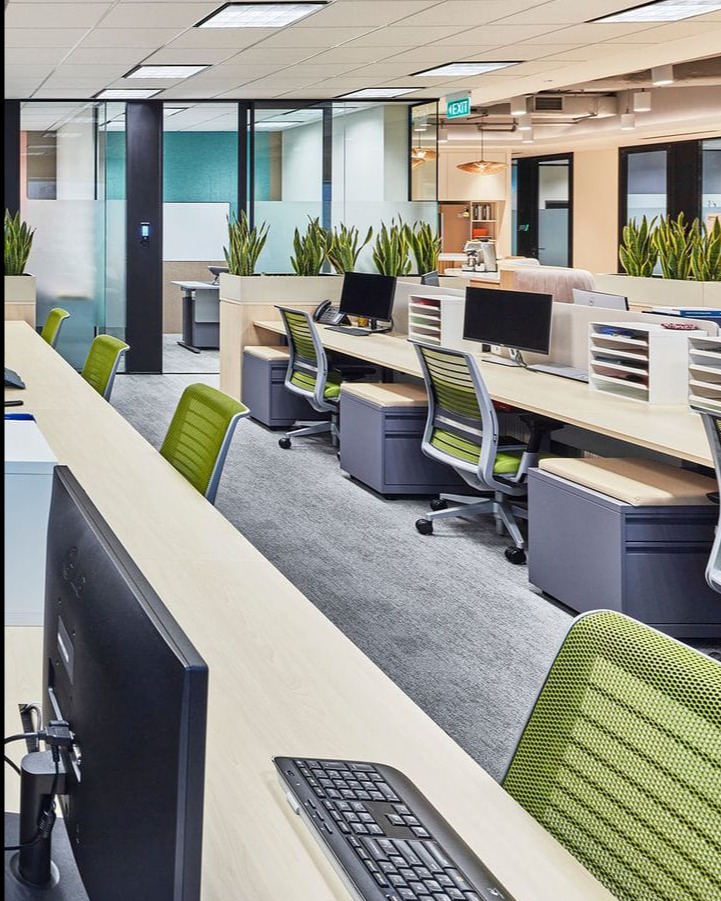 The workstation features a clean, modern design with spacious white desks arranged in clusters to encourage collaboration. Each desk is paired with a sleek mesh-back ergonomic chair that provides breathable comfort and adjustable support, ideal for long work hours. The green fabric privacy panels add a refreshing pop of color while maintaining a sense of personal space. Large floor-to-ceiling windows bring in abundant natural light, and the addition of potted plants throughout the area enhances the overall ambiance, creating a bright, calming, and productivity-focused workspace.